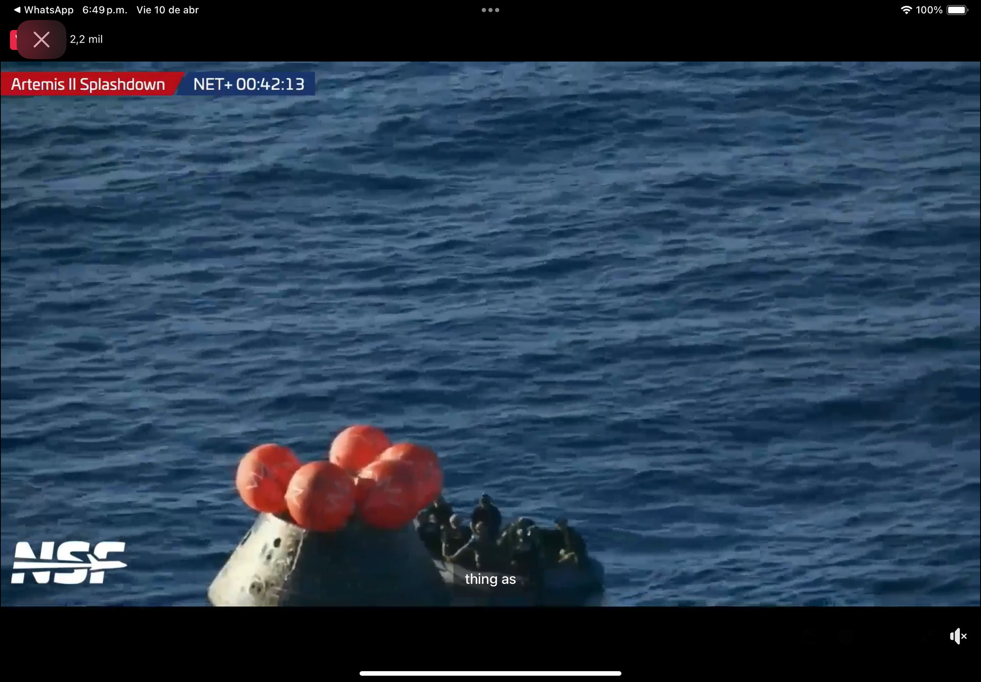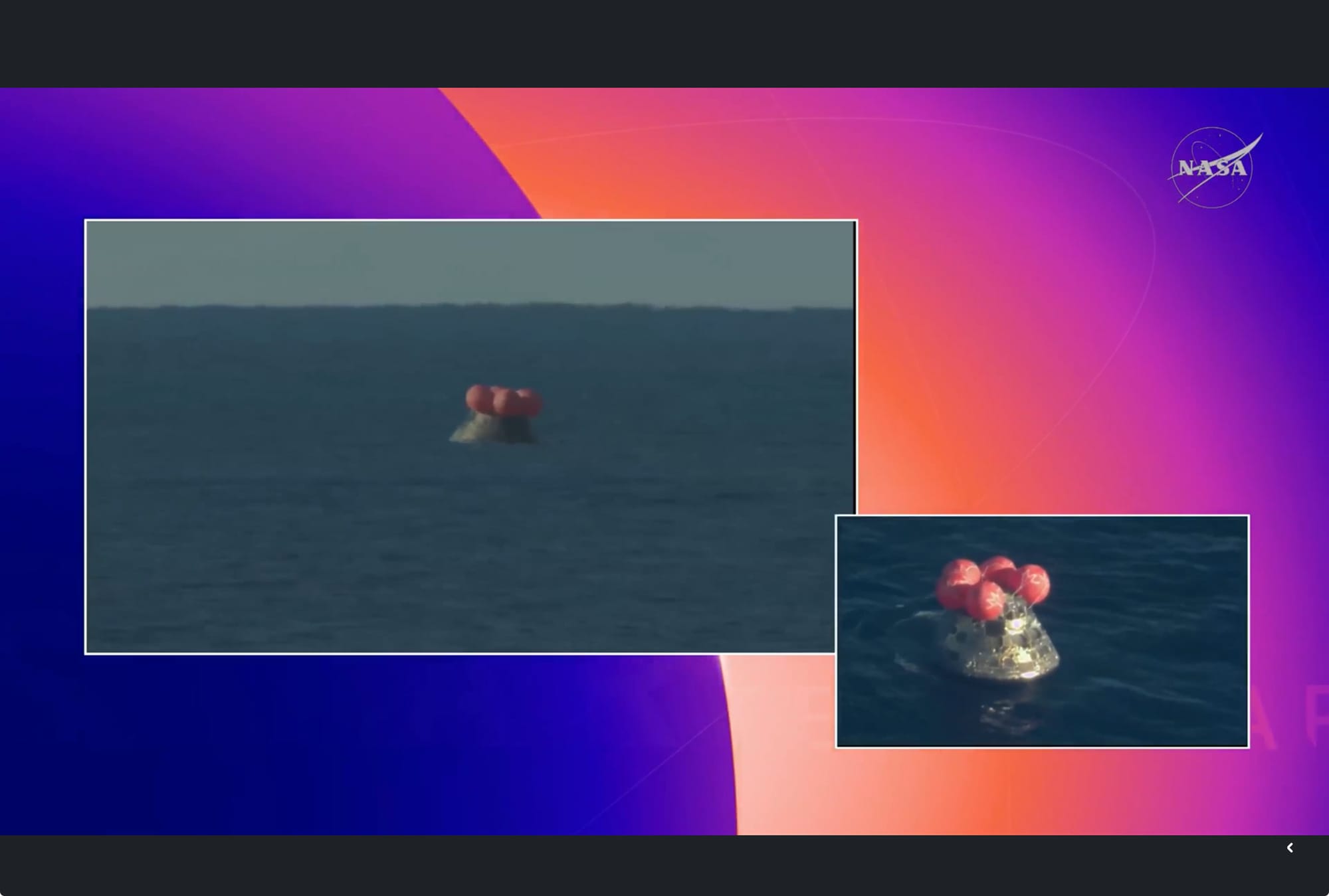 Primero se desplegaron unos pequeños paracaídas de frenado, seguidos por los tres grandes paracaídas principales que se abrieron como flores gigantes en el cielo sobre el Pacífico.