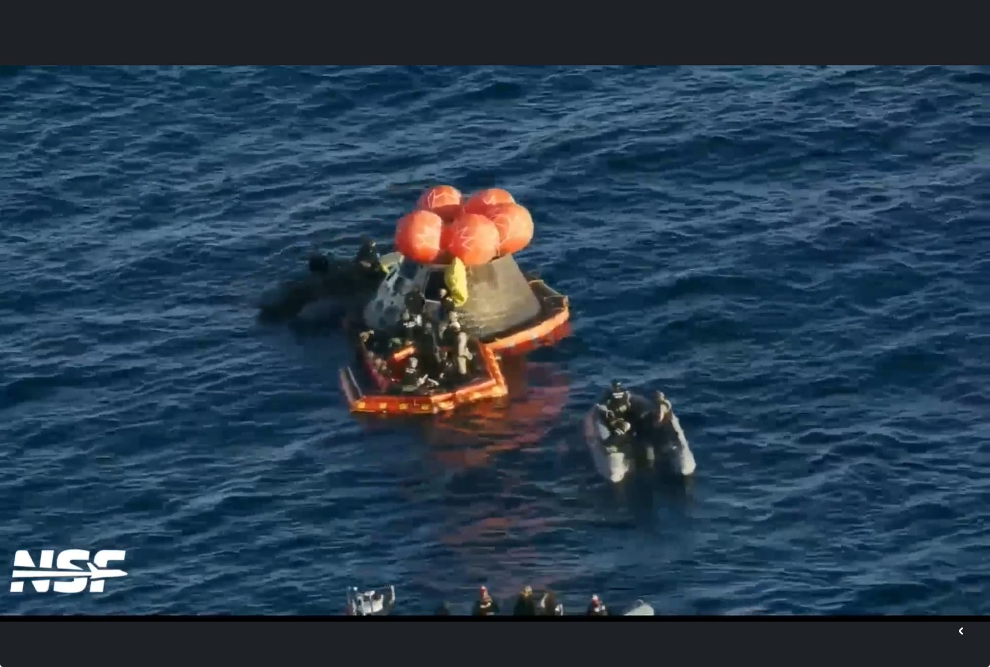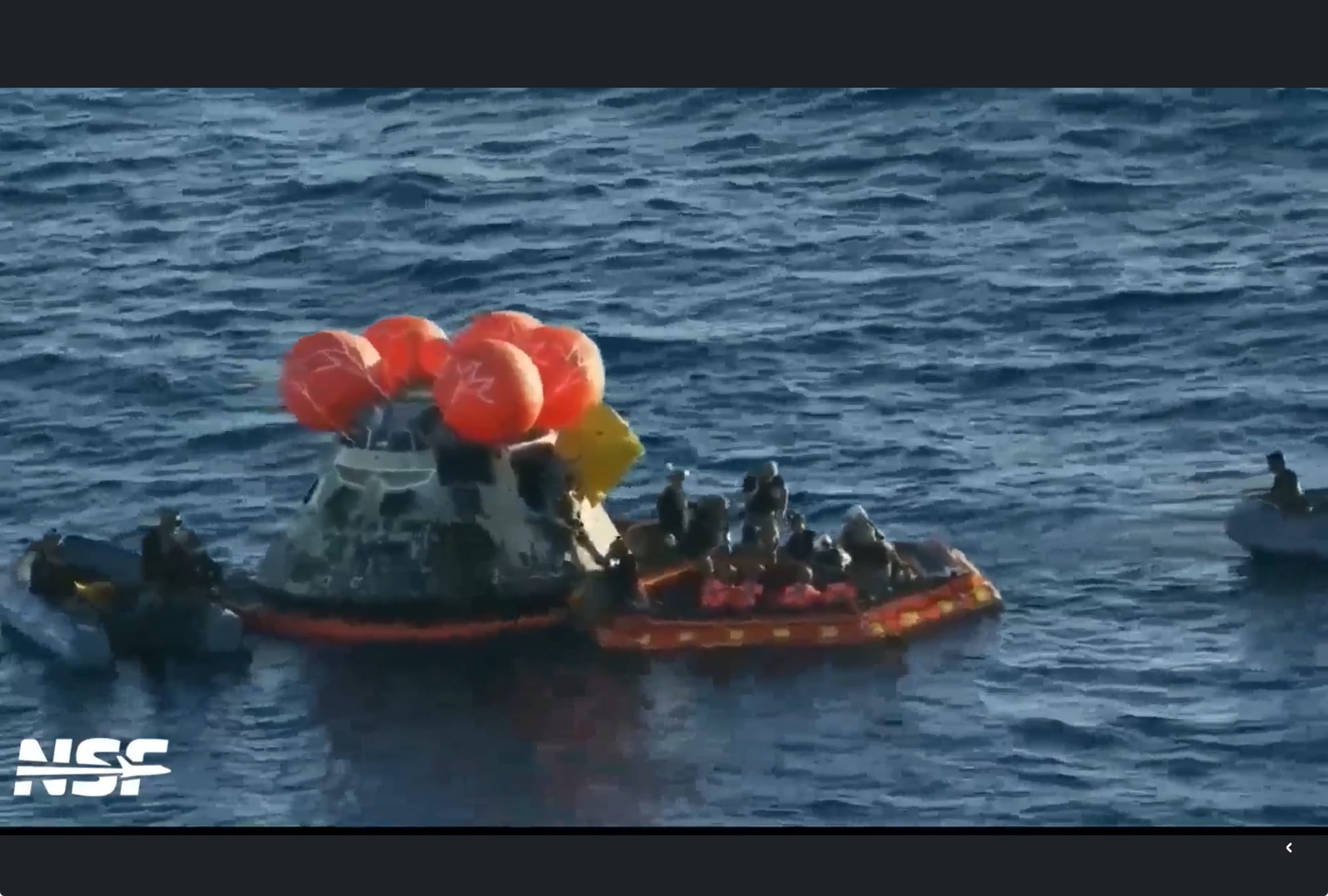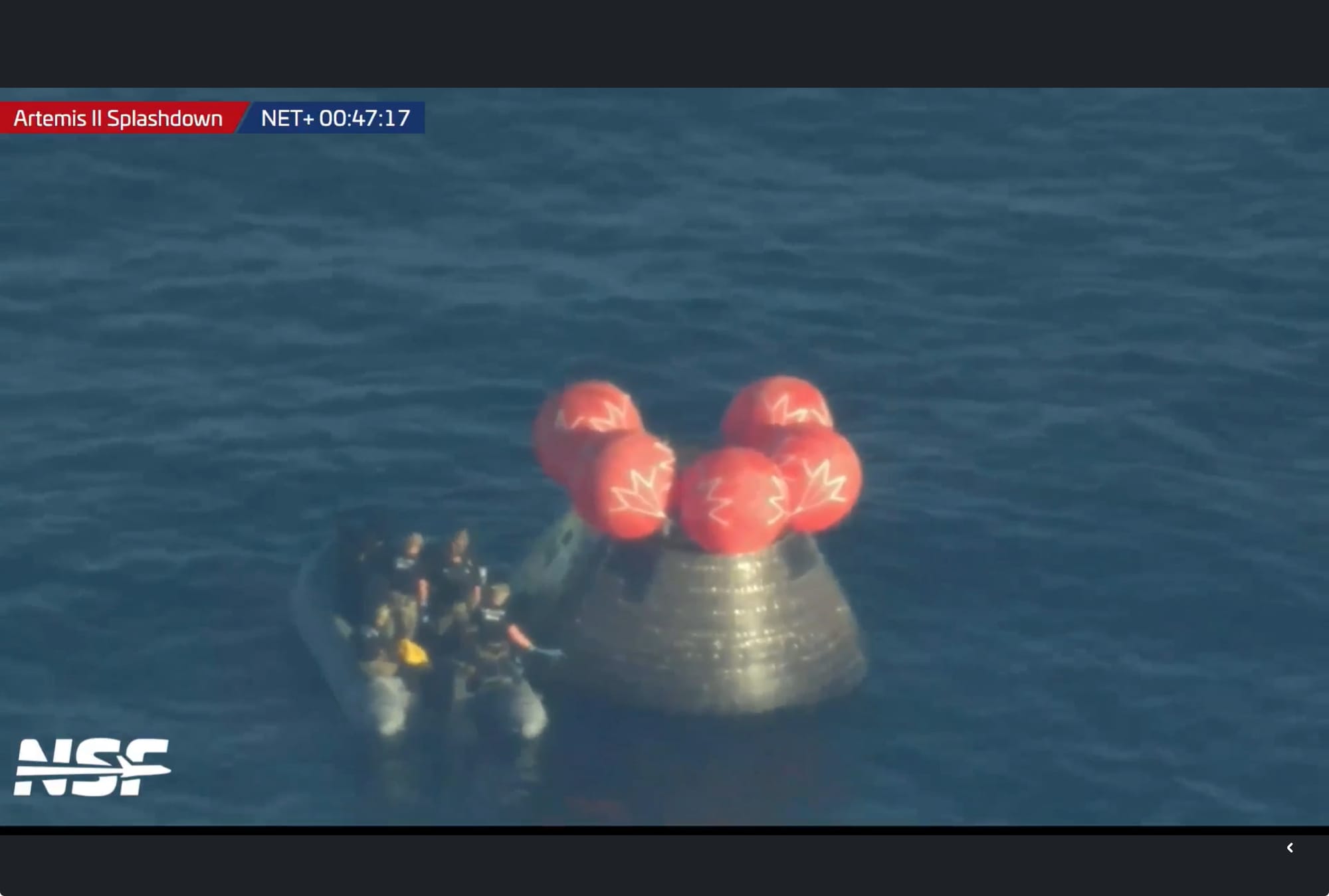 En cuestión de minutos, botes rápidos rodearon la cápsula flotante y comenzó el rescate. Los equipos se acercaron a la nave, verificaron su estado y, con todo en orden, sacaron a los cuatro astronautas: Reid Wiseman, Victor Glover y Christina Koch, de la NASA, y Jeremy Hansen, de la Agencia Espacial Canadiense.