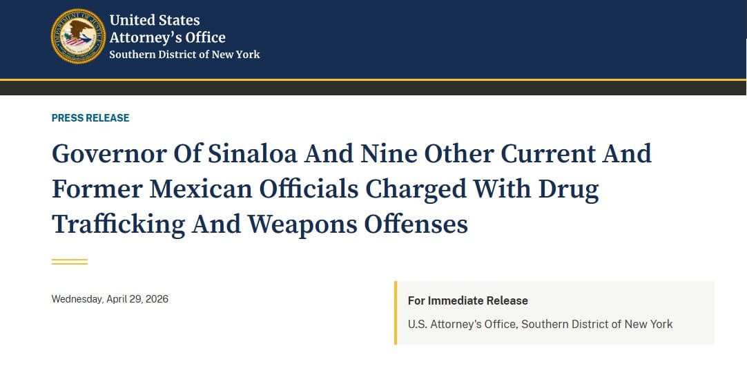 La Fiscalía de los Estados Unidos, Distrito Sur de Nueva York, dio a conocer un Comunicado de Prensa para informar que el gobernador de Sinaloa y otros nueve funcionarios mexicanos, tanto en activo como retirados, fueron acusados de narcotráfico y delitos relacionados con armas.
