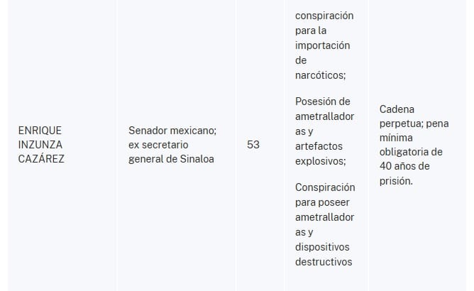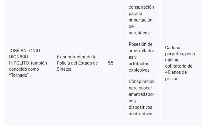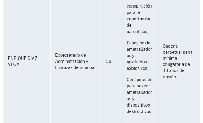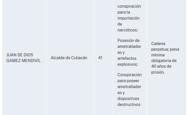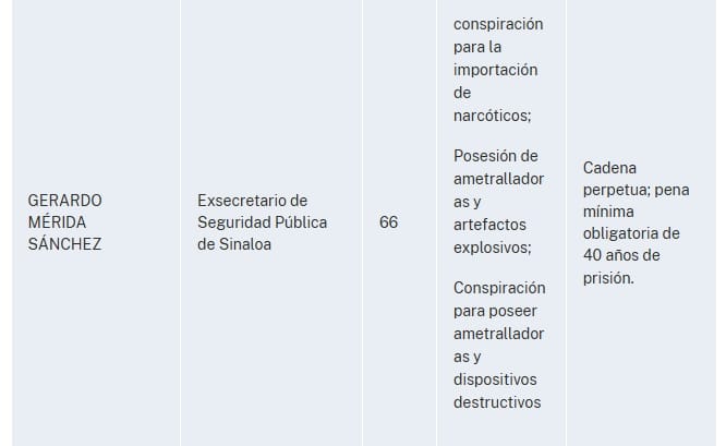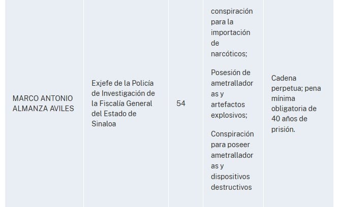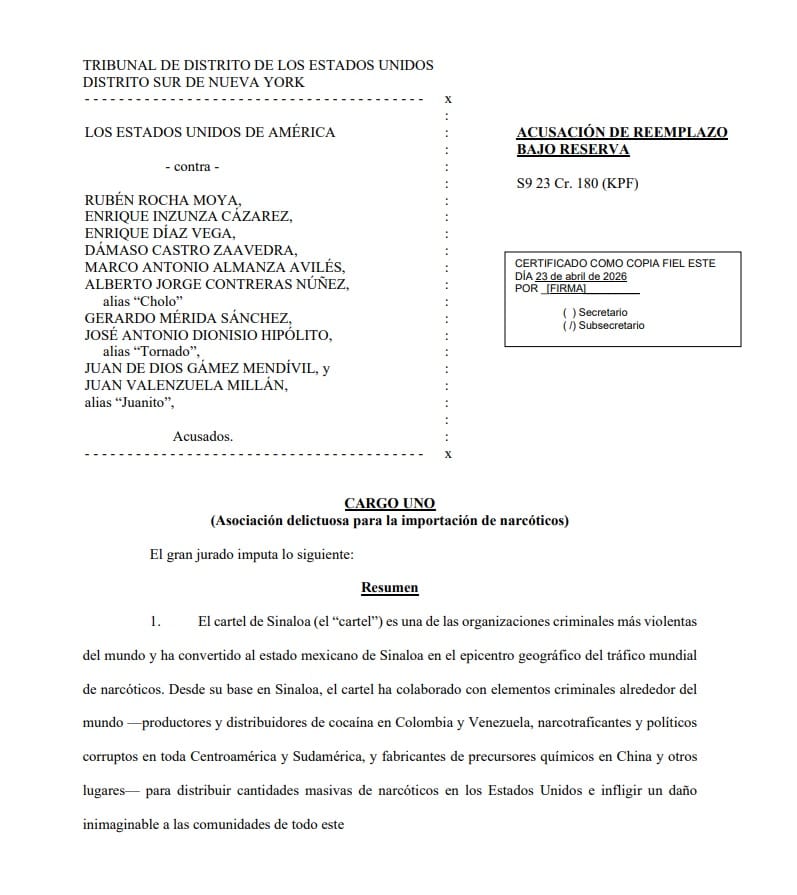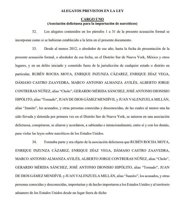 "El Fiscal Federal para el Distrito Sur de Nueva York, Jay Clayton, y el Administrador de la Agencia Antidrogas de Estados Unidos (“DEA”), Terrance C. Cole, anunciaron hoy la apertura de una acusación formal contra RUBEN ROCHA MOYA, ENRIQUE INZUNZA CAZAREZ, ENRIQUE DIAZ VEGA, DAMASO CASTRO ZAAVEDRA, MARCO ANTONIO ALMANZA AVILES, ALBERTO JORGE CONTRERAS NUNEZ, a/k/a “Cholo”, GERARDO MÉRIDA SÁNCHEZ, JOSÉ ANTONIO DIONISIO HIPOLITO, alias “Tornado”, JUAN DE DIOS GAMEZ MENDIVIL y JUAN VALENZUELA MILLAN, alias “Juanito”, con delitos de tráfico de drogas y conexos con armas.