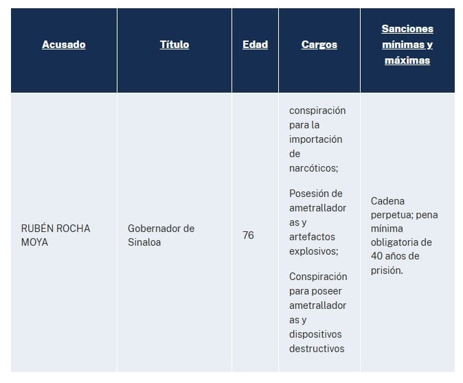 "Los acusados son todos funcionarios de alto rango, actuales o anteriores, del gobierno y las fuerzas del orden del estado mexicano de Sinaloa, incluido el actual gobernador de Sinaloa, Rubén Rocha Moya, y se les acusa de haberse asociado con el Cártel de Sinaloa para distribuir grandes cantidades de narcóticos a Estados Unidos.