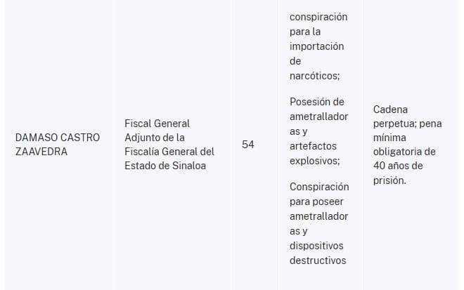 "Por ejemplo, ZAAVEDRA, subprocurador general de la Fiscalía General del Estado de Sinaloa, ha recibido aproximadamente 11,000 dólares estadounidenses mensuales de los Chapitos y, a cambio, ha protegido a miembros de la organización de ser arrestados y les ha informado sobre operaciones policiales planeadas con el apoyo de Estados Unidos.