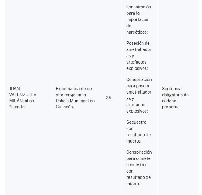 "Los acusados desempeñaron diversas funciones esenciales para el Cártel: entre otras cosas, presuntamente protegieron a los líderes del Cártel de la investigación, el arresto y el enjuiciamiento; proporcionaron información confidencial de las fuerzas del orden y del ejército a miembros del Cártel y narcotraficantes aliados para facilitar las actividades delictivas del Cártel; ordenaron a miembros de agencias policiales estatales y locales, como la Policía Estatal de Sinaloa, la Policía de Investigación de la Fiscalía General del Estado de Sinaloa y la Policía Municipal de Culiacán, que protegieran cargamentos de droga almacenados en México y en tránsito hacia Estados Unidos; y permitieron que miembros del Cártel cometieran actos de violencia brutal relacionados con el narcotráfico sin consecuencias.