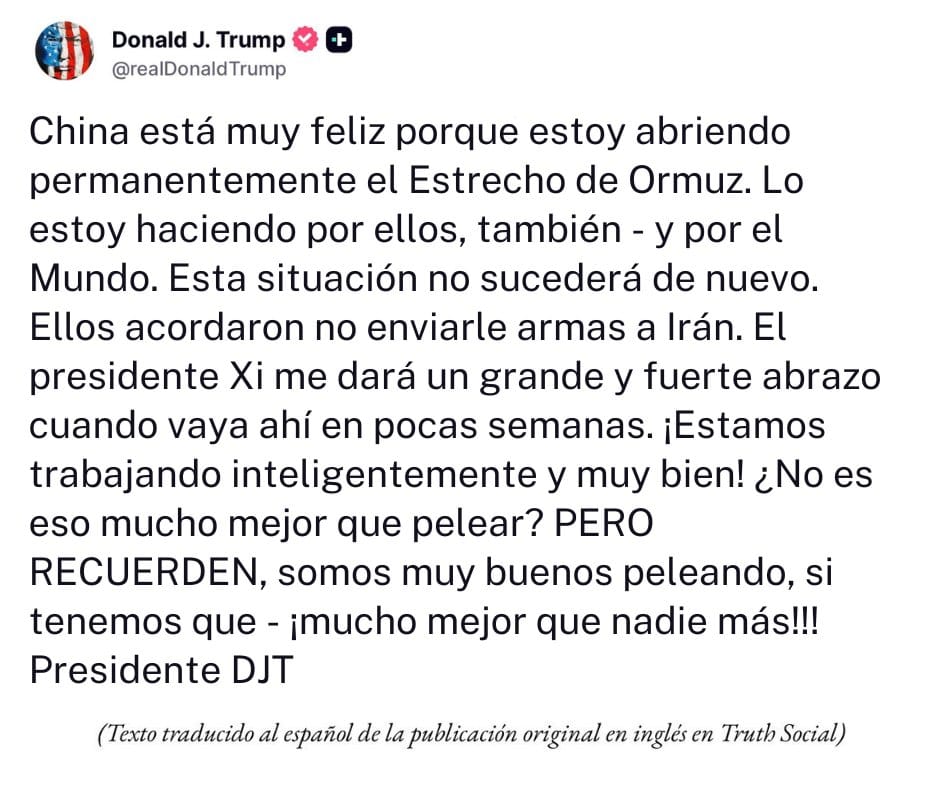 "China está muy contenta de que esté abriendo permanentemente el Estrecho de Ormuz. Lo hago también por ellos, y por el mundo. Esta situación no volverá a repetirse", escribió.