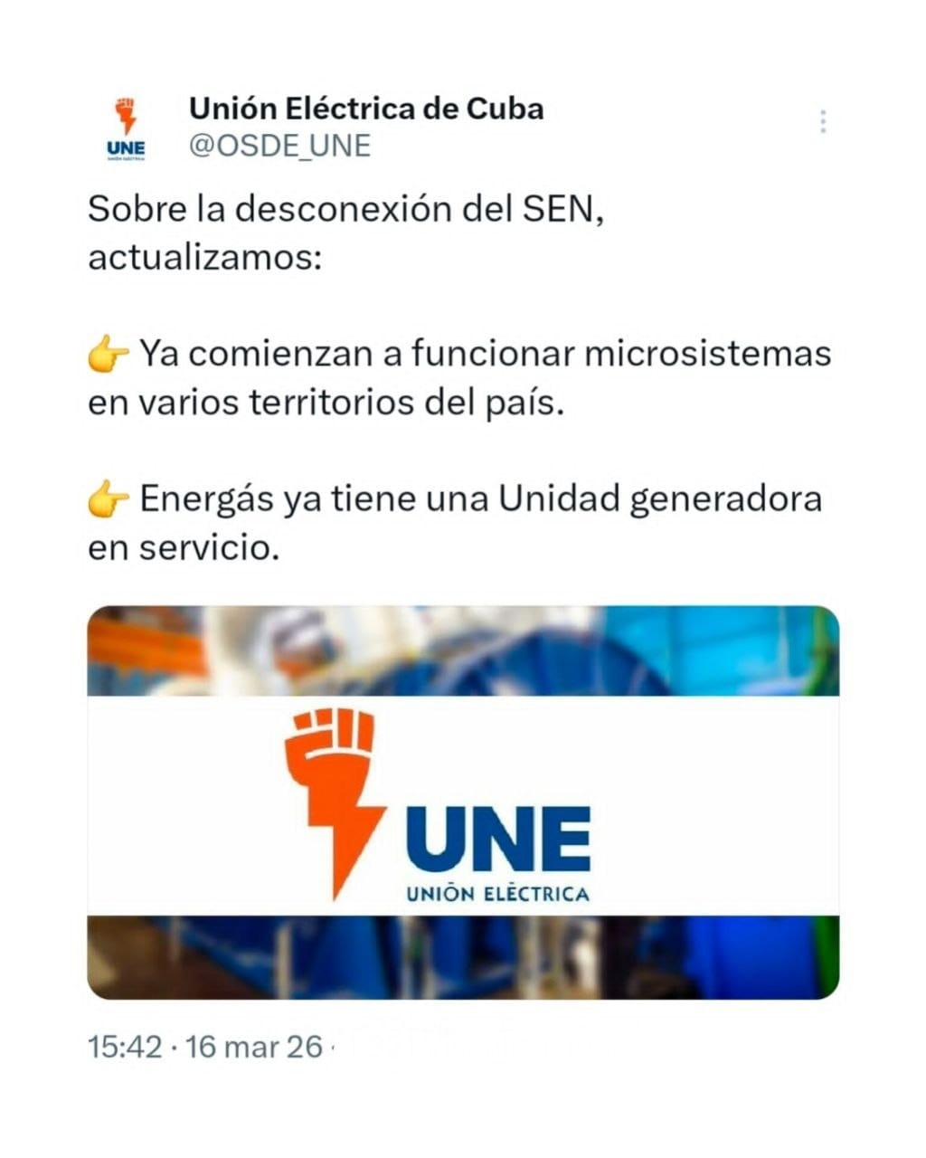 La Unión Eléctrica de Cuba informó que ocurrió una desconexión total del Sistema Electroenergético Nacional cubano y que comienzan a implementarse los protocolos de restablecimiento.