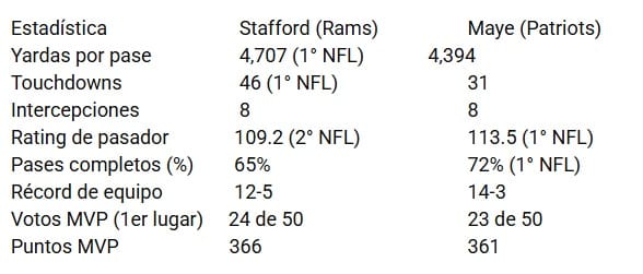 Los números de Stafford hablan por sí solos. Lideró la NFL en yardas por pase y en touchdowns aéreos. Terminó segundo en rating de pasador (109.2), solo detrás de Maye (113.5). Completó al menos el 70% de sus pases en cinco partidos y registró un rating superior a 100 en 12 encuentros.