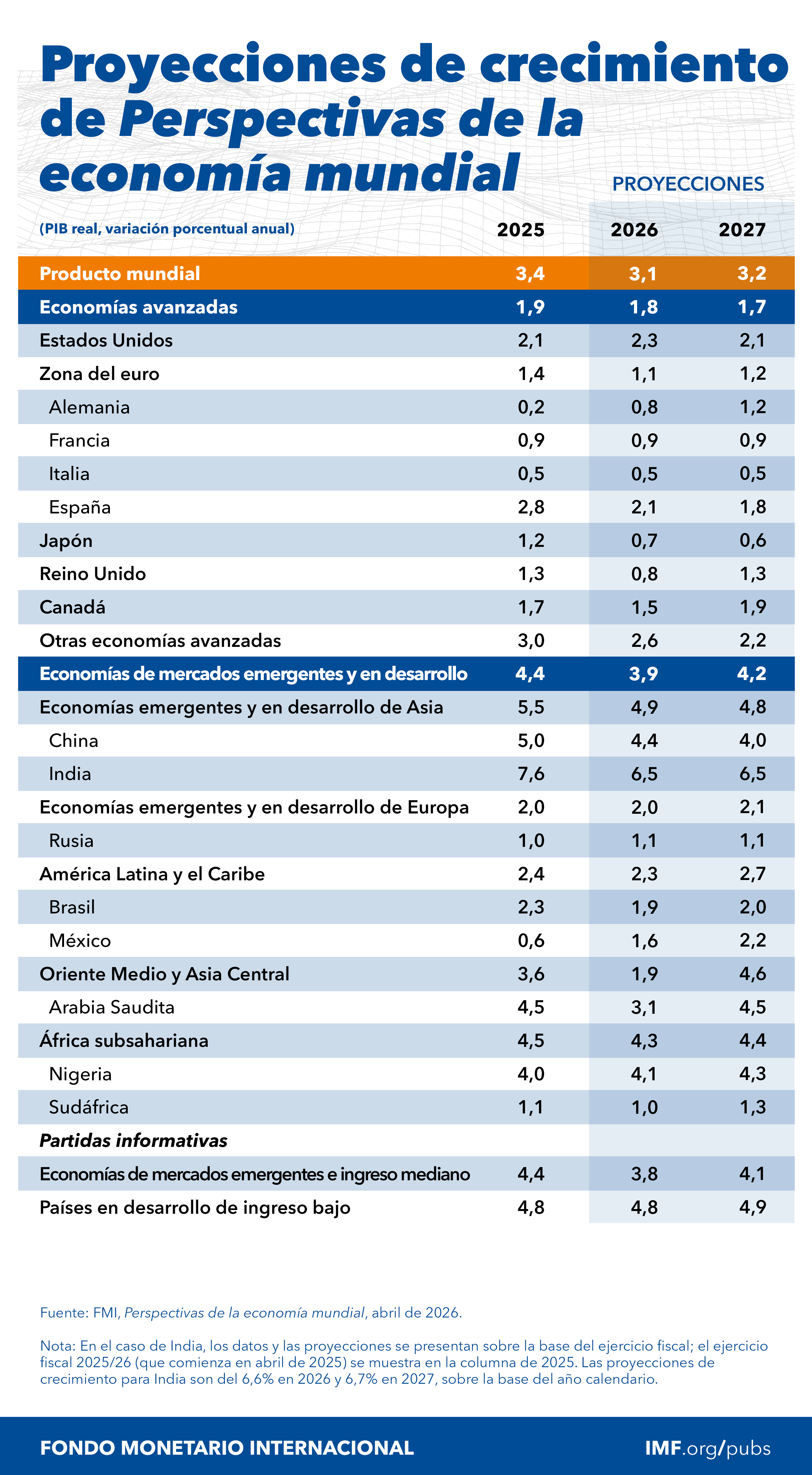 En su informe de abril de 2026, el FMI rebajó su previsión de crecimiento mundial para 2026 al 3.1 por ciento del PIB global, manteniendo la de 2027 en 3.2 por ciento.