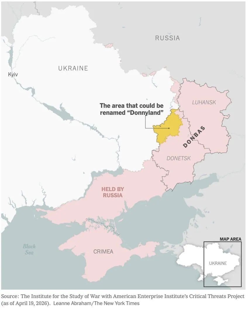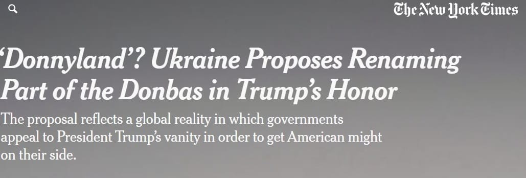 De acuerdo con un reportaje del periódico The New York Times, funcionarios ucranianos plantearon informalmente llamar "Donnyland" a una parte disputada del Donbás, y que eso se discutió como una manera de apelar a la inclinación del Presidente Donald Trump por ver su nombre en proyectos políticos.